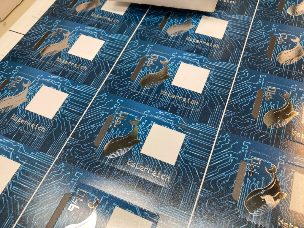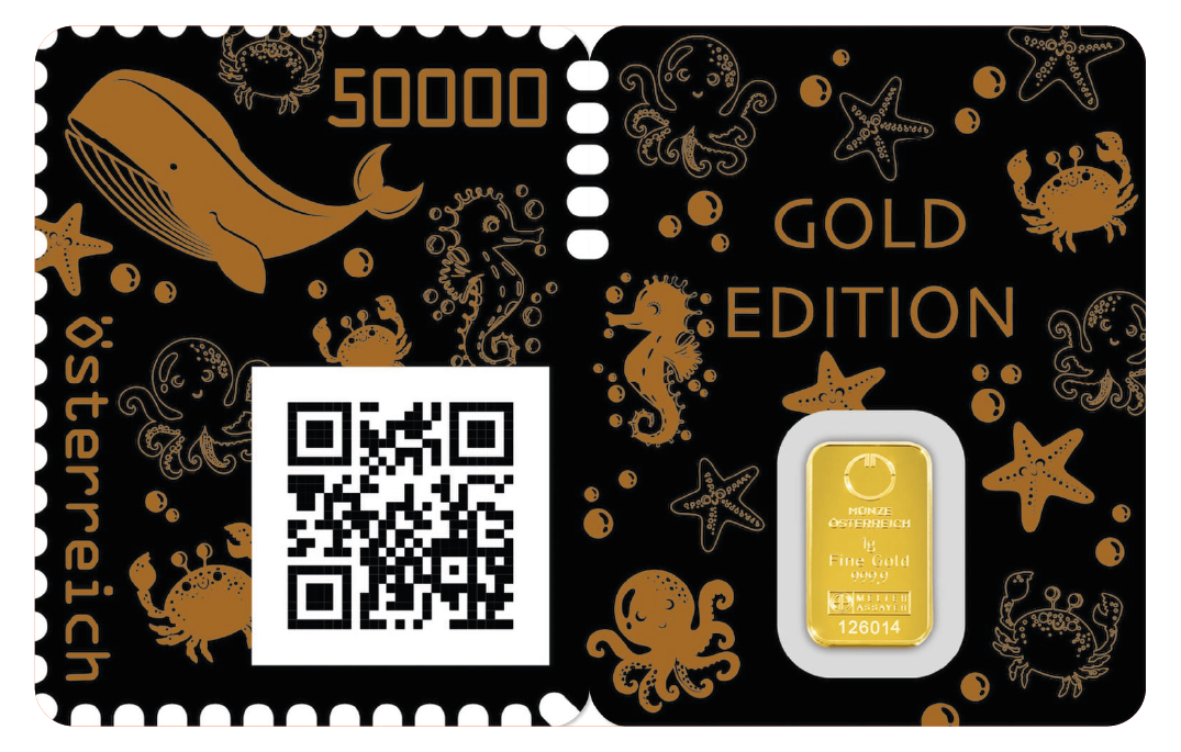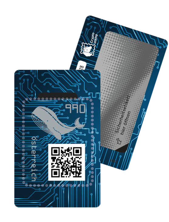 CRYPTO STAMP 3.0 – THE WHALE The limited edition third issue of the Crypto stamp, limited to 100,000 exemplars, brought in numerous innovations. In addition to the “crypto whale” – a new design symbolising major players on the crypto market – an NFC-based authenticity check was introduced. This means that by using a smartphone with NFC capability, you can check whether a stamp has already been activated or not. In addition to this, the move to the decentralised platform Gnosis, built on the Ethereum blockchain, was completed. Those who own large amounts of crypto assets are known as "Whales" in the scene. While marine mammals are threatened with extinction, the number of Whales is continuously increasing. These really "big fish" are referred to as such because their decisions make high waves in crypto markets. Colour distribution: • Black: 52,3 % • Green: 26,7 % • Blue: 13,3 % • Yellow: 6,7 % • Red: 1 %