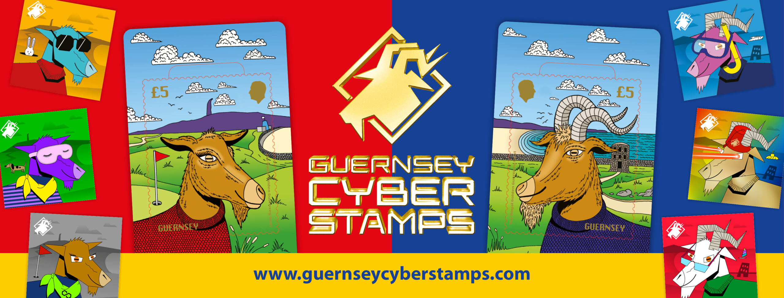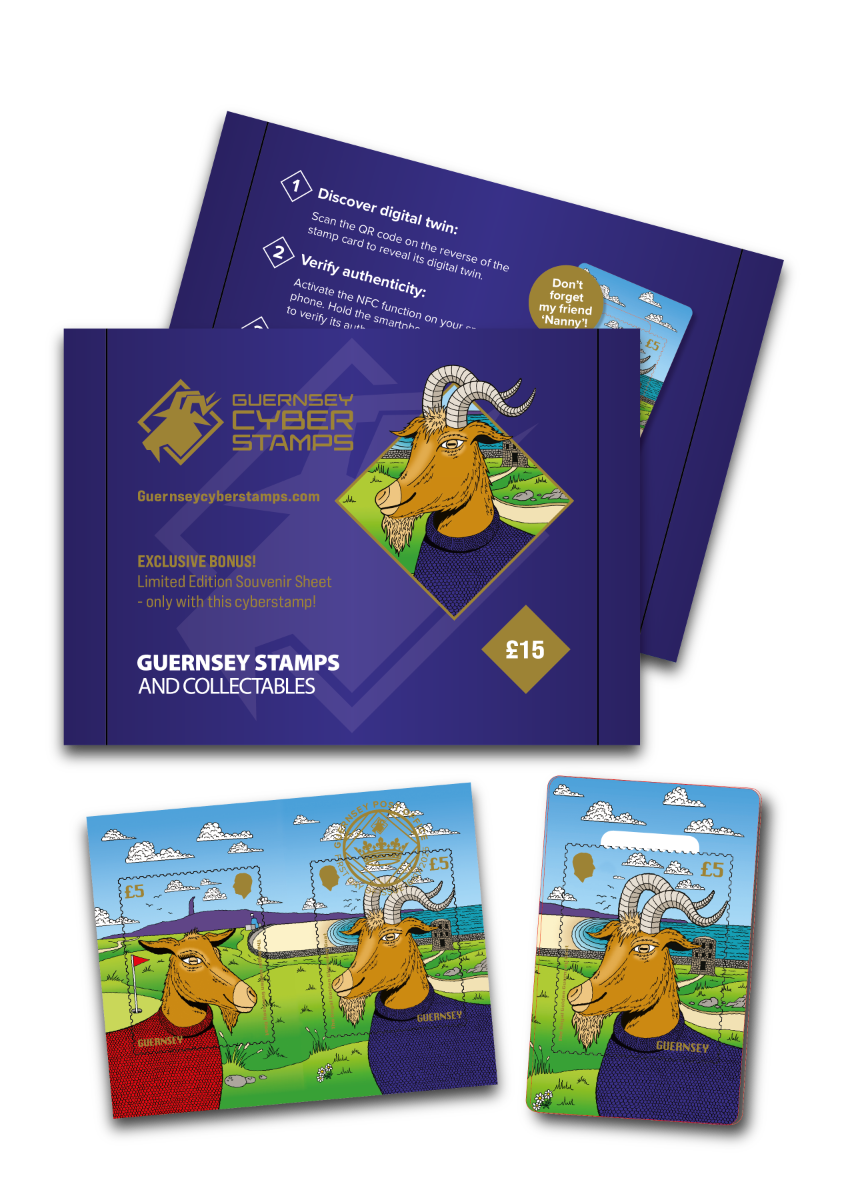 Now available in the shopMeet Nanny Introducing one of the stars of our cyberstamp collection, Nanny, the charming Golden Guernsey Goats. Our cyberstamp collection features illustrated characters with variable attributes. The subject of this unique cyberstamp edition is the Royal Golden Guernsey Goat, a rare breed only found on the enchanting islands of Guernsey, and therefore the perfect subject for our first foray into the world of digital collectables. Contained within the packet is a souvenir sheet with a special cancel - this cancel is only available with this product. Issuing postal operator: Guernsey Post
