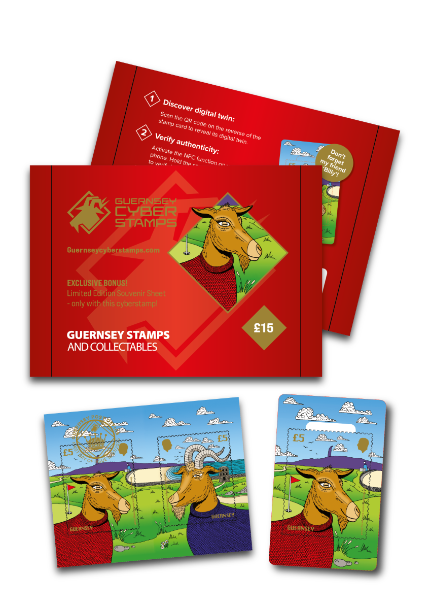 Now available in the shopMeet Billy Introducing one of the stars of our cyberstamp collection, Billy, the charming Golden Guernsey Goats. Our cyberstamp collection features illustrated characters with variable attributes. The subject of this unique cyberstamp edition is the Royal Golden Guernsey Goat, a rare breed only found on the enchanting islands of Guernsey, and therefore the perfect subject for our first foray into the world of digital collectables. Contained within the packet is a souvenir sheet with a special cancel - this cancel is only available with this product. Issuing postal operator: Guernsey Post