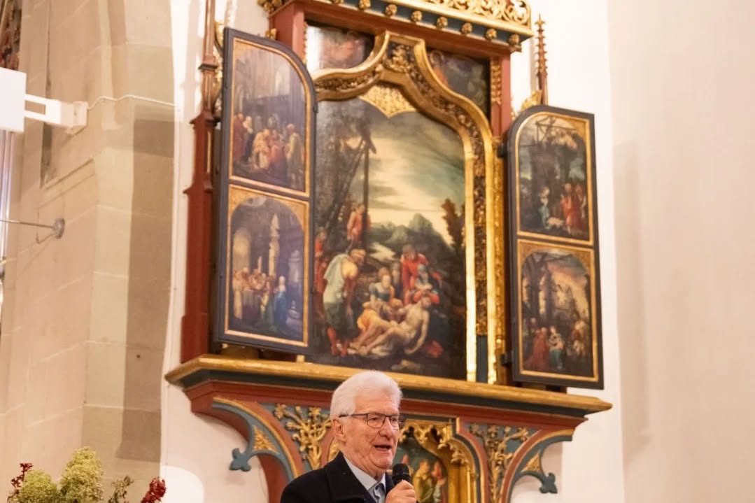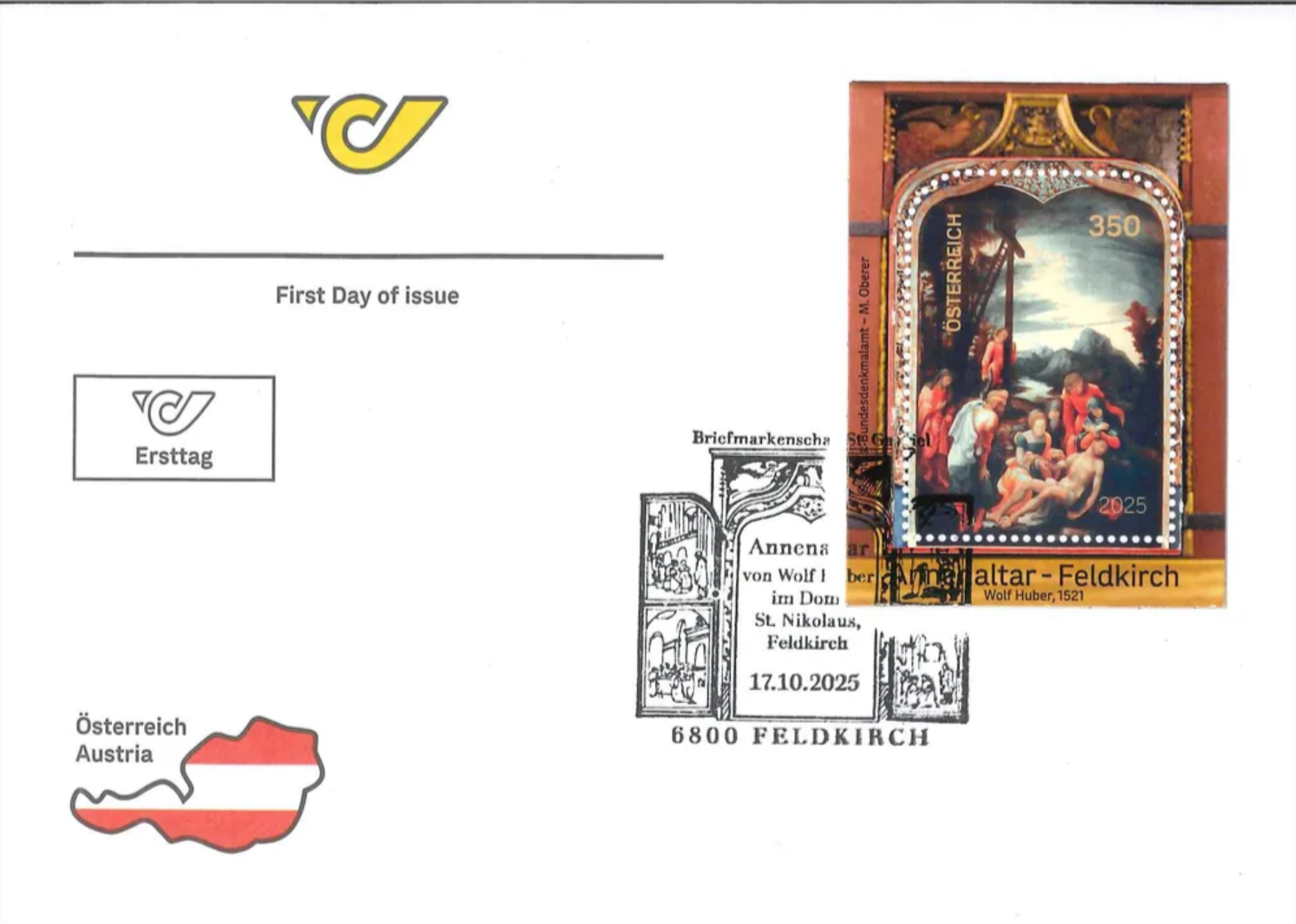 The St Ann's Altar was created in 1521 by Wolf Huber, a painter, draughtsman and master builder from Feldkirch, who is regarded as a leading figure of the Danube School. Produced in his workshop in Passau, it is considered Huber’s main work and represents the transition from Late Gothic to Renaissance. The detailed landscapes and buildings in the background of the altar’s paintings emphasise the solemnity of the religious motifs, while the figures appear in bright, luminous colours. During a reconstruction in 1822, the altar’s side panels were lost; they were only rediscovered in 1953 and, after many detours, returned to Feldkirch Cathedral. In 2005, the St Ann's Altar was finally reunited with its original side panels. The miniature sheet features the central panel of the altar. The closed wings show scenes from the life of Saint Anne, the mother of Mary. When opened, the inner sides reveal episodes from the life of Jesus as well as the Lamentation of Christ, the altar’s main image, which is reproduced on the stamp itself.