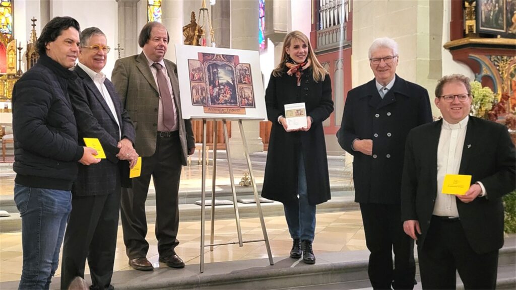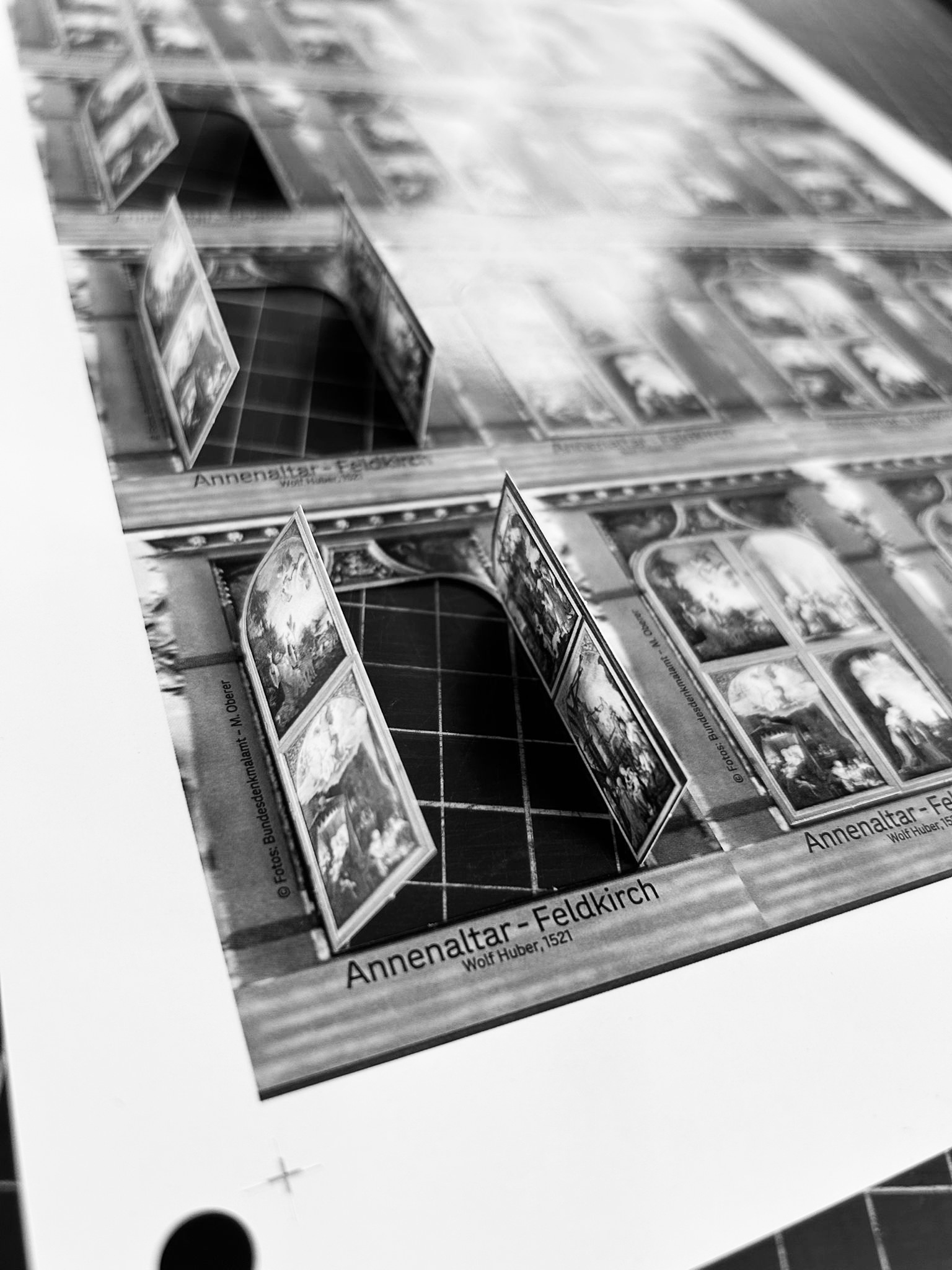 During production, the outer side of the altar was first printed on cardboard. The material was then turned over to print the inner sides of the folding doors on the same cardboard. For the opening mechanism of the folding doors, the fold lines were perforated and cut.