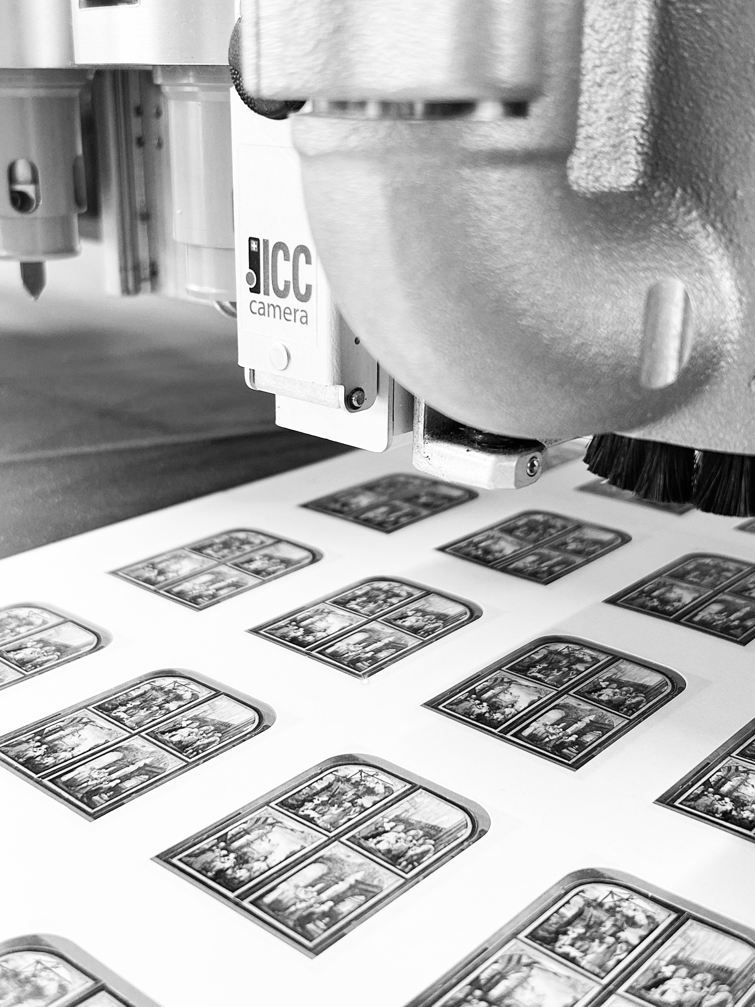 The two layers of the stamp block were subsequently bonded together using a double-sided adhesive film, in which the altar window had been die-cut beforehand.