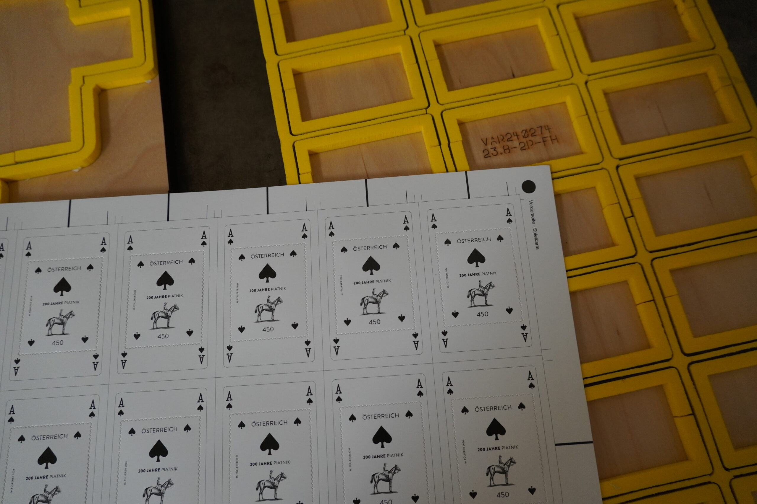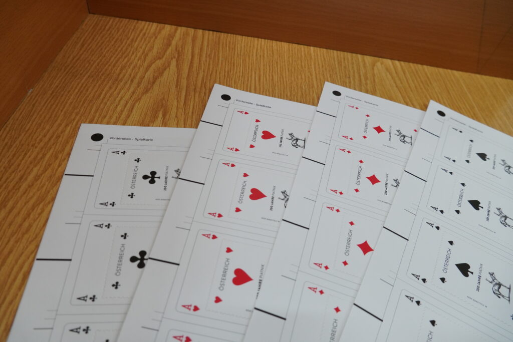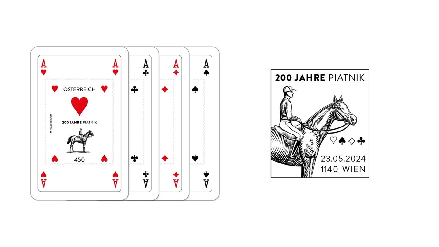 The traditional Viennese company Piatnik, now the biggest games manufacturing company in Austria, celebrated 200 years of its existence in 2024. Austrian Post and Stampfinity congratulated it on this special Jubilee with original miniature sheets in the shape of a playing card. The four miniature sheets are also real playing cards, namely aces in the suits hearts, diamonds, spades and clubs. They are made from card, which was treated with the varnish used for real playing cards after printing. The gummed stamp itself features the characteristic Piatnik logo; it has been cut out separately and can be detached from the sheet. As a really original feature, the